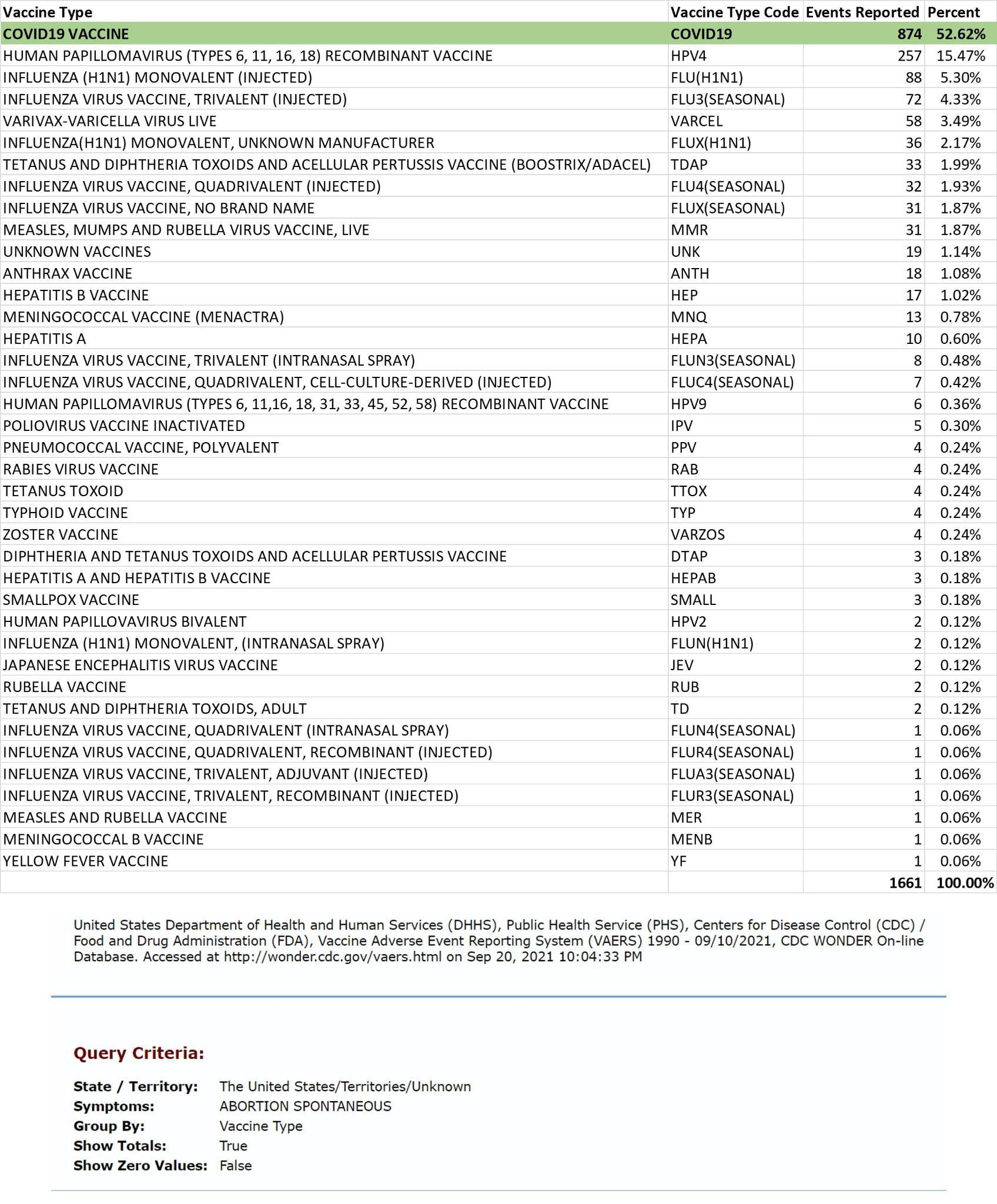 - Spontaneous Abortion: 53% [Comparison to all vaccines; Date of extraction: 09/20/21]