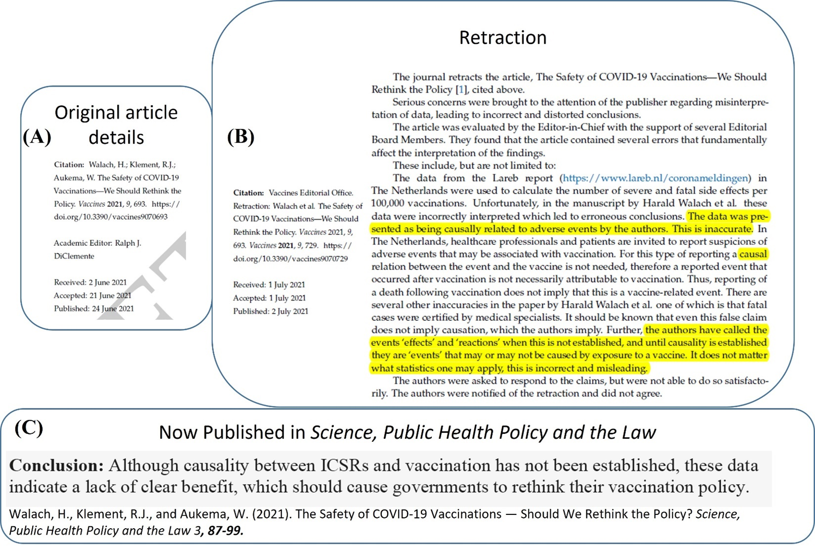 Figure 11: Walach et al, 2021 – (A) original publication information in the journal Vaccines. (B) publication date of retraction and retraction. (C) Conclusion statement from Walach et al, 2021, now published in Science, Public Health Policy and the Law.