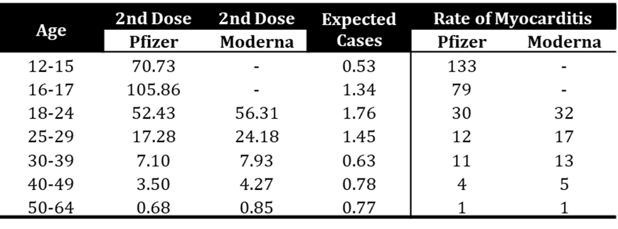 - “Our findings are relevant to the public, clinicians and policy makers. First, there was an increase in the risk of myocarditis within a week of receiving the first dose of both adenovirus and mRNA vaccines, and a higher increased risk after the second dose of both mRNA vaccines…Third, the increased risk of myocarditis after vaccination was higher in persons aged under 40 years.” [NOTE: this is a group that has an average fatality rate from COVID-19 of ~0.01% (calculated from O’Driscoll et al. (2021) taking the average of the percentages for ages less than 40)]