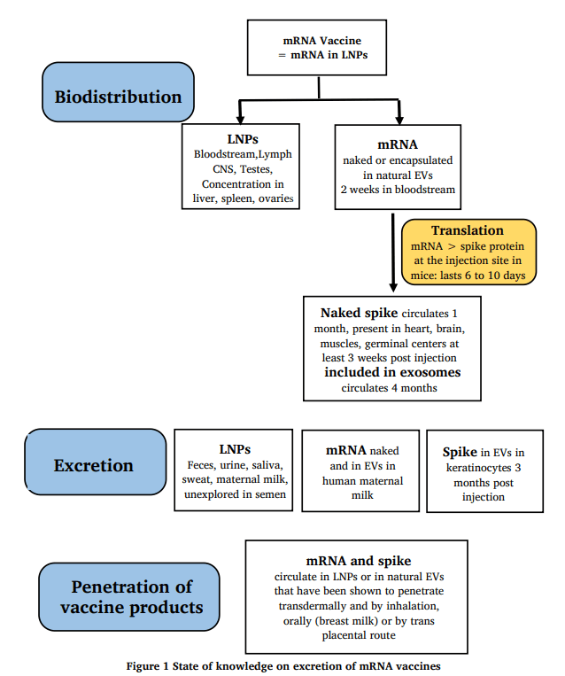 - “Vaccine mRNA-carrying lipid nanoparticles spread after injection throughout the body according to available animal studies and vaccine mRNA (naked or in nanoparticles or in natural exosomes) is found in the bloodstream as well as vaccine spike in free form or encapsulated in exosomes (shown in human studies). Lipid nanoparticles (or their natural equivalent, exosomes or extracellular vesicles (EVs)) have been shown to be able to be excreted through body fluids (sweat, sputum, breast milk) and to pass the transplacental barrier. These EVs are also able to penetrate by inhalation and through the skin (healthy or injured) as well as orally through breast milk (and why not during sexual intercourse through semen, as this has not been studied).” (Banoun, 2022)