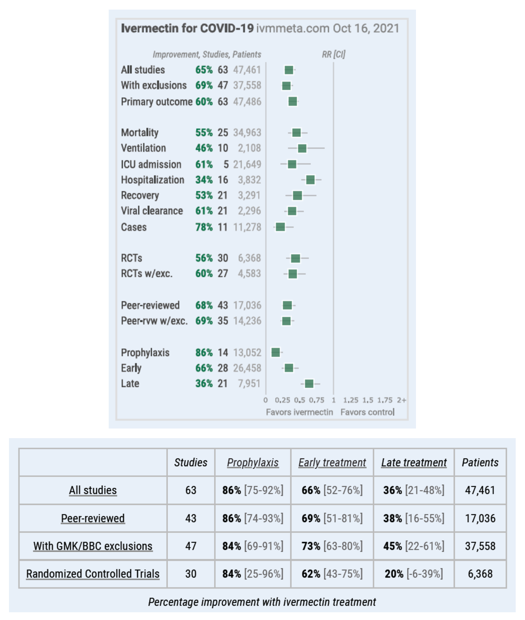 - “Meta-analysis of 15 trials found that ivermectin reduced risk of death compared with no ivermectin…ivermectin prophylaxis reduced COVID-19 infection by an average 86% (Bryant et al., 2021)” (Bilezikian et al., 2020)