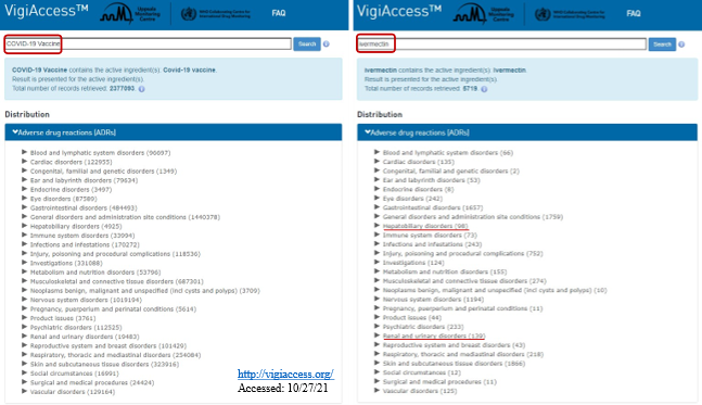 - There appears to be a concerted antagonistic effort in the medical field (often in letters, and not peer reviewed articles, to the editor of medical journals) towards the potential efficacy of ivermectin in the treatment of COVID-19 (e.g. Temple et al., 2021). Part of the efforts seem directed/focused on highlighting the side effects of ivermectin. Below is data extracted from the WHO adverse event website VigiAccess™ (http://vigiaccess.org); data accessed 10/26/21. Keep in mind that ivermectin was approved for medical use in 1981, while the COVID-19 vaccines were “approved” in late 2020.