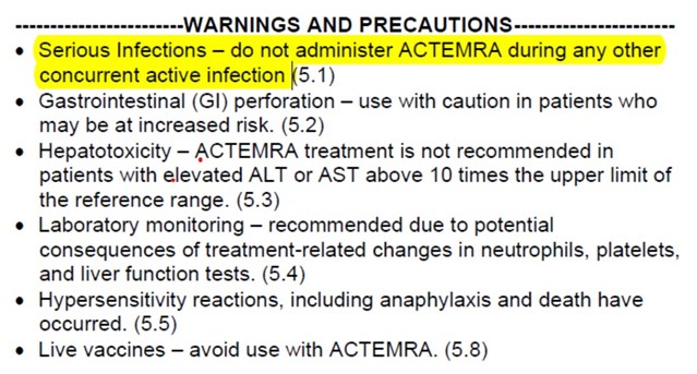 - Moreover, the FDA Fact Sheet on tocilizumab, under “Warnings and Precautions” states: